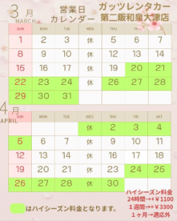 格安レンタカーのガッツレンタカー!GWや夏季、年末年始の営業情報や入庫車情報など、ガッツレンタカー 第二阪和泉大津店から皆様へのお知らせです。